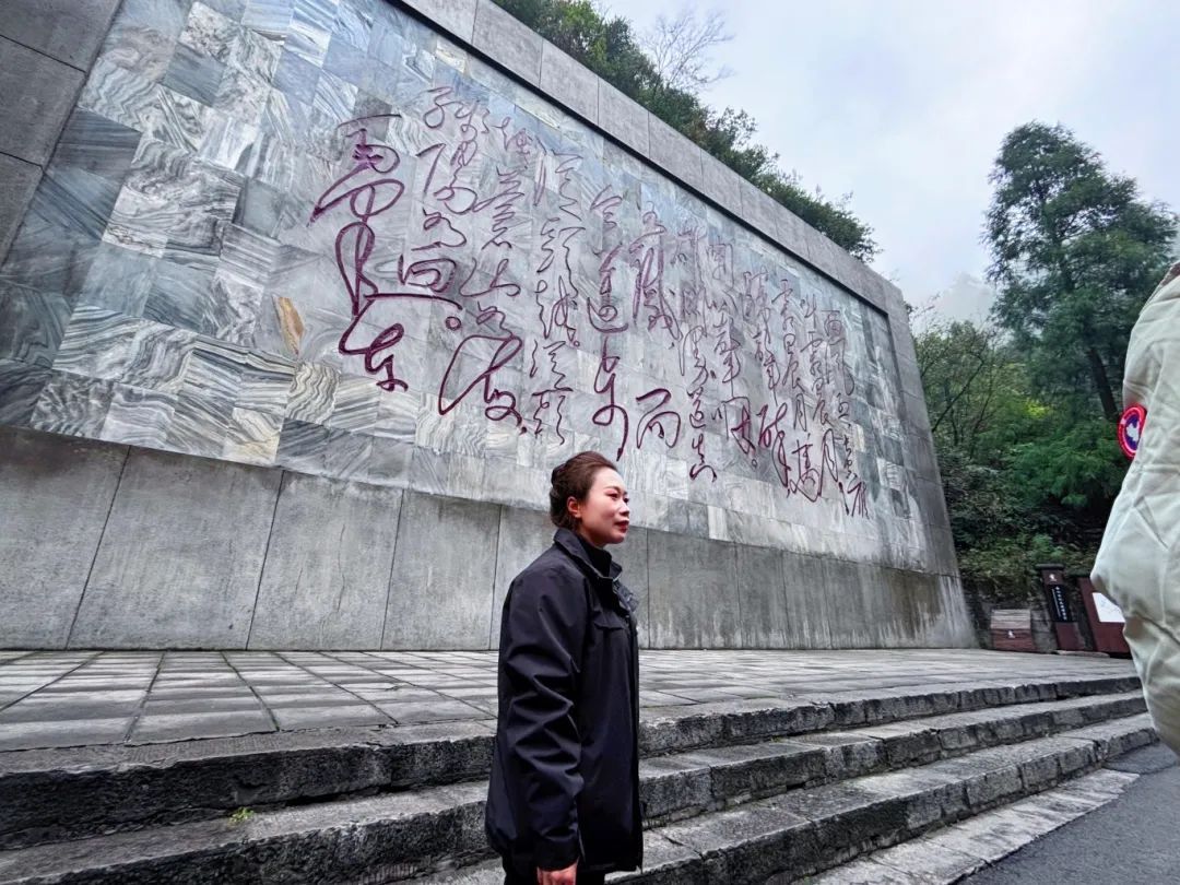 “各位朋友,此刻所在的位置就是..的毛泽东词碑,词碑建于1973年,碑高13.55米,宽25米,象征二万五千里长征,用396块大理石嵌成碑面,镌刻毛泽东《忆秦娥·娄山关》手迹,许多人因为这首词慕名而来……”在娄山关景区,随着讲解员苟蓉温柔且坚定的话语响起,周围变得异常安静,游客们都被这段壮烈事迹所吸引。