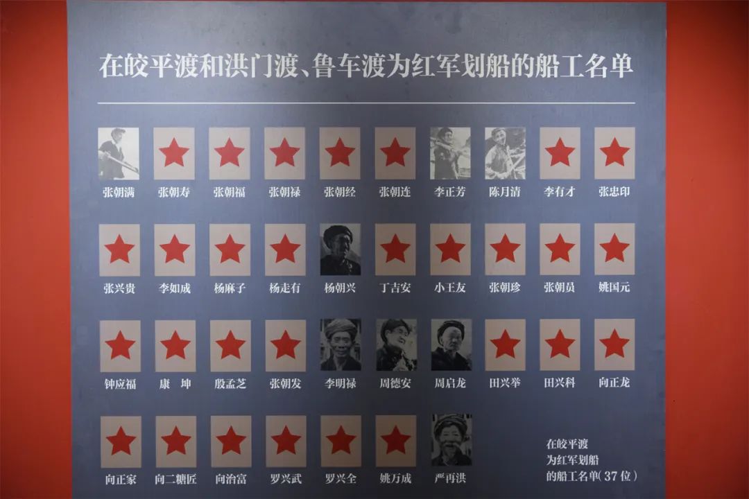 在纪念馆内的一面照片墙上,写有37人的名字,他们就是当年在皎平渡口帮助红军渡江的船工,渡江还得从这37名船工说起。