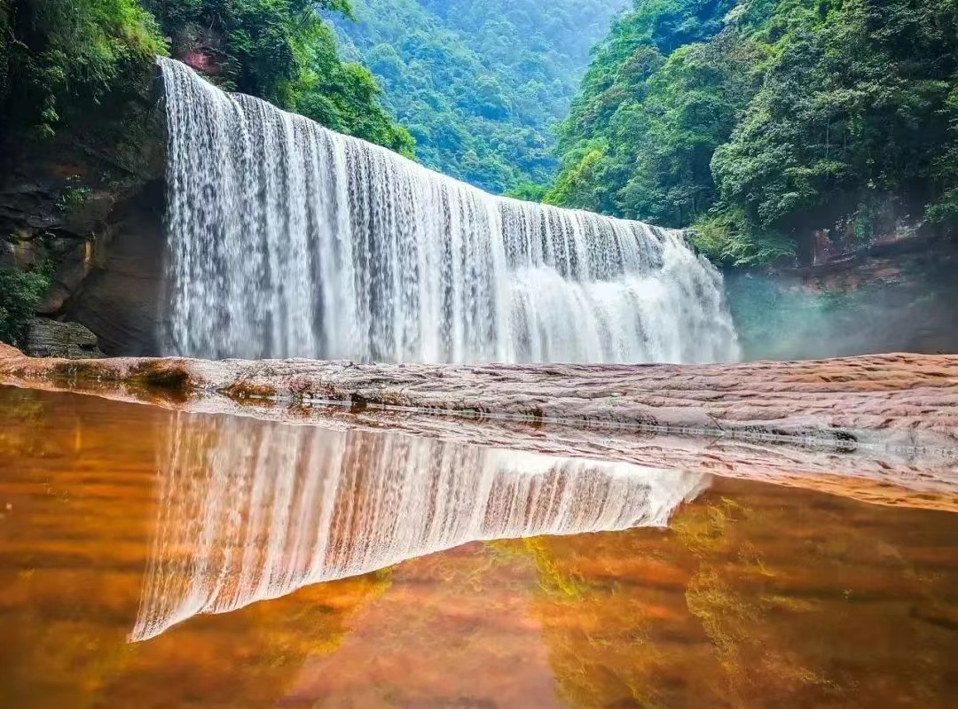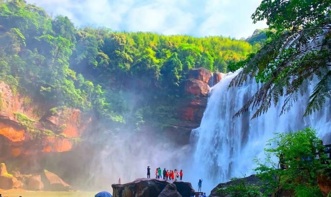 赤水大瀑布是“赤水丹霞”申报..自然遗产的核心组成部分之一。随着朱红色的河水奔腾而下,与瀑布两侧的丹霞地貌交相辉映红、黄、橙、绿交织在一起,色彩斑斓,形成了一幅绚丽的自然画卷。中秋假期,大瀑布景区以其壮观的自然美景和独特的地质特征,吸引了8000余名游客前来“打卡”。